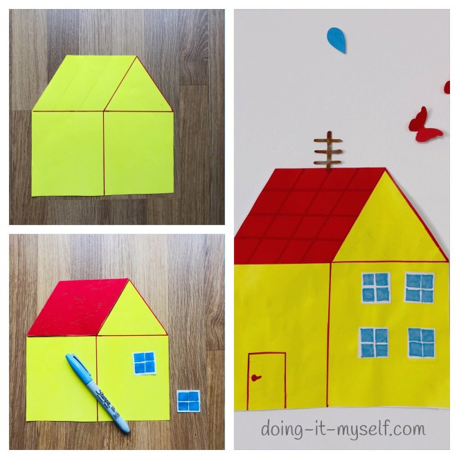 - For the windows, I cut squares of white paper and coloured the ‘glass’ look with a sky blue marker pen. I did not mark or draw the ‘glass’ part with a ruler. Instead simply shaded it as a free hand drawing.
