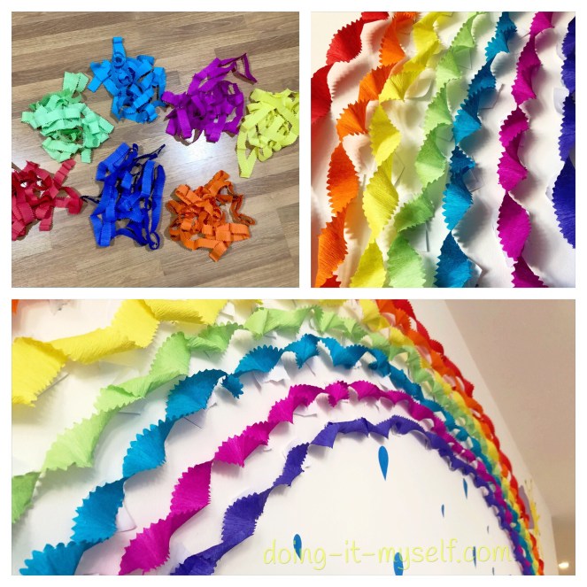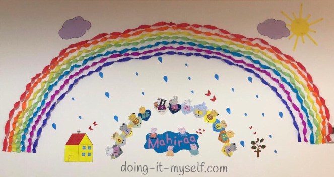 I made the rainbow with paper streamers. And the Peppa Pig house, the apple tree, rain drops etc were made with paper.